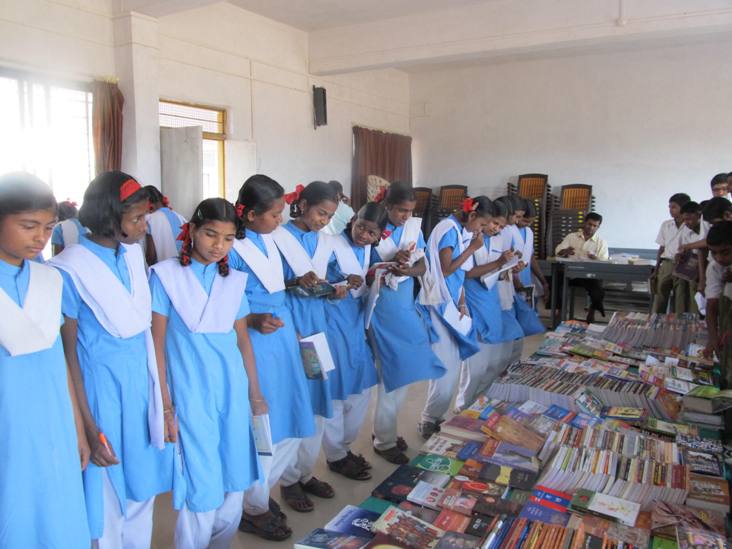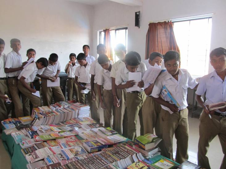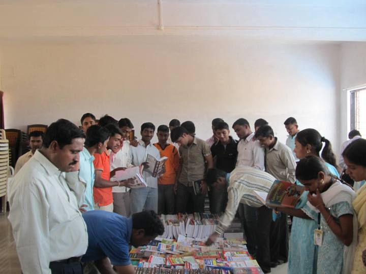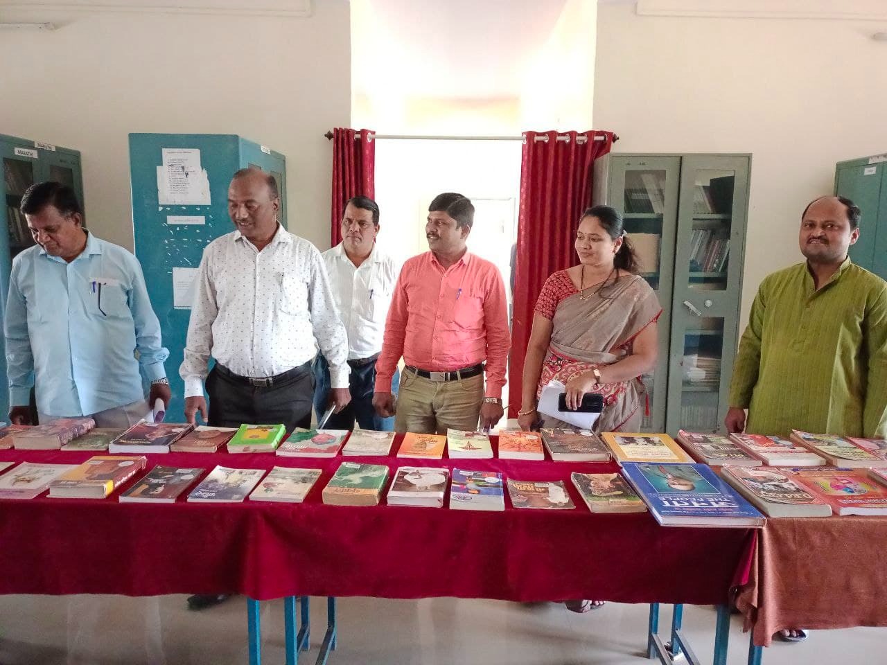 पुस्तक प्रदर्शनात पुस्तक पाहणी करताना सेवक वर्ग